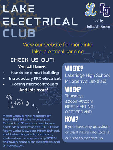 An immersive club to learn more about electrical engineering and design in STEM! Led by the electrical members of the Lake Monsters Robotics team :) Our curriculum is all-encompassing, ranging from electrical theory to practical electronics to hands-on electrical engineering